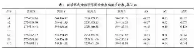 为了检验试验区内地形图的平面精度,一共实地量测量1 0 个平面检查点,地形图平面检查点的平面精度统计见表1 所示。