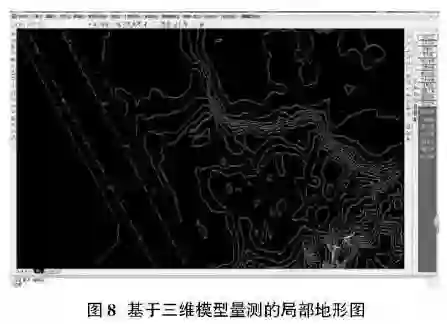 为了检验基于三维模型量测地形图的可行性和精度,本次实验在试验区采用RTK 技术均匀量测一些特征点,包括道路拐角、房角,墙角、井盖,沟渠等可以快速识别的特征点,以这些实地量测的检查点坐标作为已测地形图的检核点。在生成的三维模型上均匀取大量的地形地物点,将这些点导入CASS中成图,见图8 所示。通过判断检查点点位中误差和高程中误差的大小是否满足测绘大比例尺地形图的规范要求,进行验证基于三维模型量测地形图的可行性和精度。