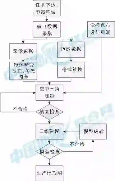 基于无人机倾斜摄影生成三维模型测绘地形图主要包括:任务下达与申请空域、外业航飞数据采集、像控点布设与量测、内业空中三角测量、生成三维模型和制作地形图几个部分,具体技术流程见图1 所示。