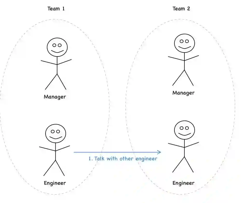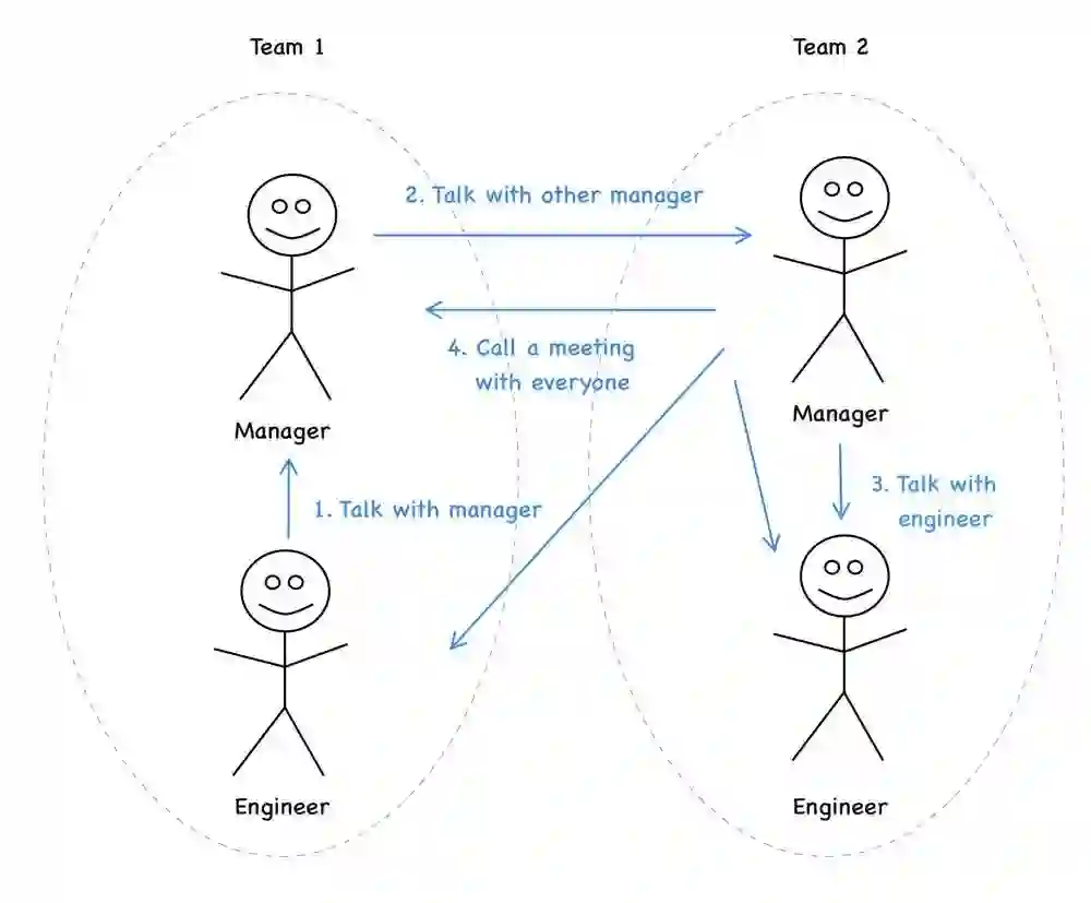 传统公司会鼓励分层沟通。这样做不仅是为了“屏蔽”工程师,也是因为这些地方的管理人员更愿意成为信息枢纽,不放弃对这部分的控制。以下是向其他团队提出问题或进行询问的过程,通常如下: