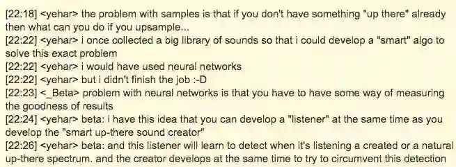 我2000年开始考虑使用神经网络为上采样(重新采样到更高的采样频率)的数字音频生成缺失的高频,以令人信服而不是准确的方式。2001年我收集了音频库进行训练,以下是从2006年1月20日开始的EFNet#musicdsp Internet Relay Chat(IRC)日志的一部分,其中我 (yehar) 与另一个用户 (_Beta) 讨论了这个想法: