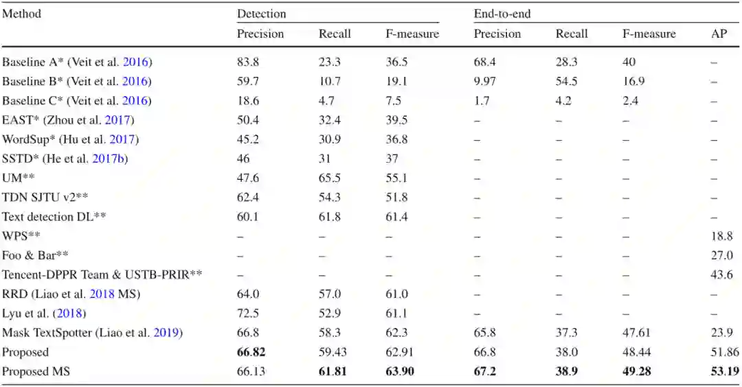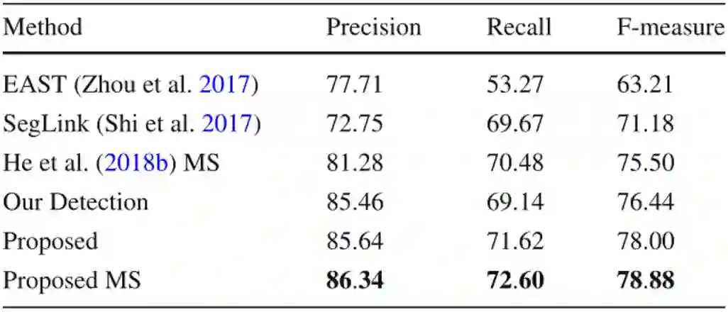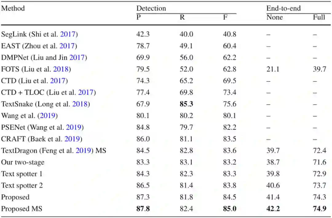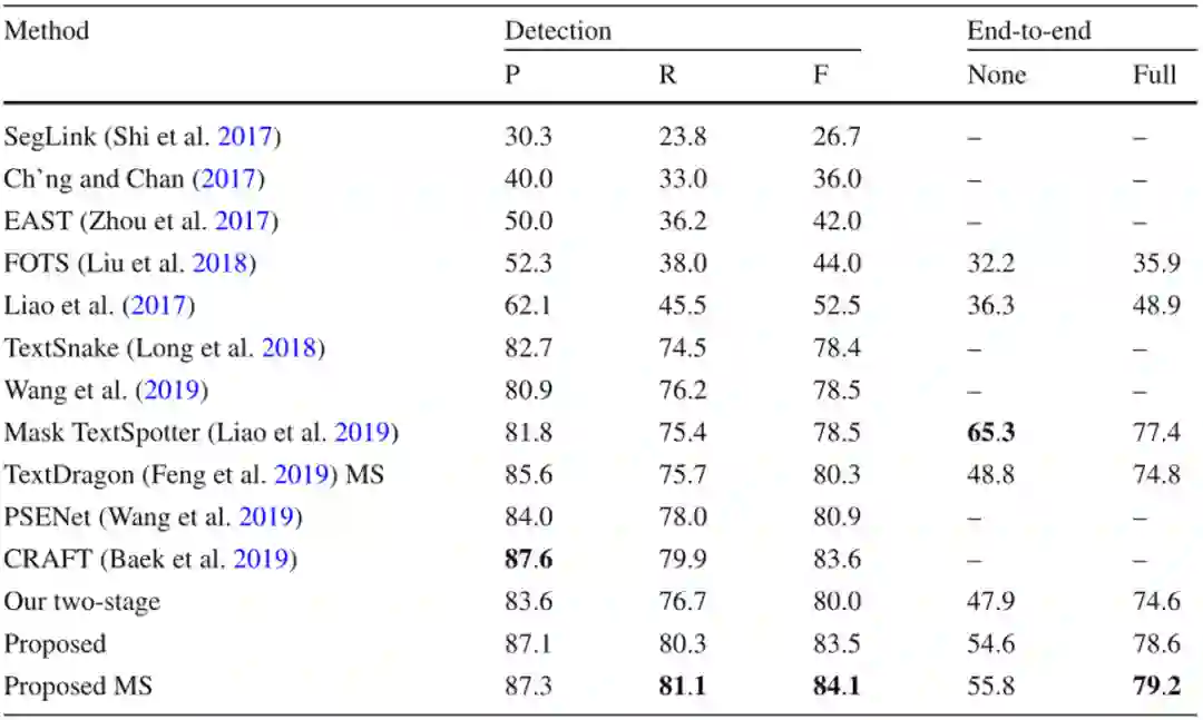 本文在五个公开数据集上评价了提出的方法,包含两个任意形状文本数据集和三个多方向数据集,其中四个是英文数据集,另一个数据集主要包含中文。如Table 1所示,文中的方法在CTW1500上达到了最佳的性能,尽管CTW1500包含很多长文本行,但是所提出的自底向上检测器不受感受野的限制。这使得该方法相对于基于自顶向下的方法有明显的优势。文中的方法同样在Total-Text达到了最佳性能,如Table 2所示。由于Total-Text要求词级别的检测,所以这个数据集的难点在于区分相邻的文本行。受益于所提出的自顶向下检测器,该方法可以很容易的区分相邻的文本行,使该方法不受粘连问题的影响。如Table 3,4,5所示,该方法同样在三个多方向数据集上获得了最佳的性能。尽管该方法是针对任意形状文本行设计的,但是和之前针对四边形文本设计的方法相比,该方法取得了更佳的性能。此外在中文数据集CASIA-10K上,尽管中文文本行尺度变化更为丰富,所提出的残差双尺度机制使该方法对尺度变化更鲁棒,结果显示该方法可以同时处理中文和英文。
