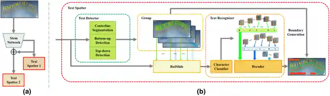 融合自底向上和自顶向下的方法可以提升任意形状端到端识别结果,如Fig.1 (c)所示。一方面,自顶向下的方法中的文本行感兴趣区域可以提供文本行的边界信息。尽管相邻文本行间的局部区域距离很近,但是他们的文本行感兴趣区域有着很低的IoU。因此,自顶向下方法中的文本行感兴趣区域是区分相近文本行的有力依据。另一方面,自底向上方法中的局部区域不受感受野的限制。尽管感受野难以覆盖长文本行,但是通过聚合局部区域的方式,仍然可以获得完整的文本边框。因此,自底向上的方法能够更好地适应多种形状的文本行。