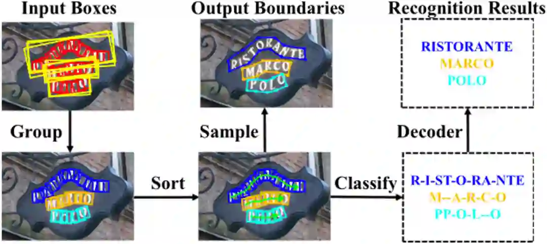 针对任意形状场景文本端到端识别的方法可以被大致分为自底向上和自顶向下两类。自底向上的方法[1]将文本行看作局部区域的组合,通过首先检测和识别局部区域,之后将结果融合的方式完成端到端识别。然而,其中的融合操作容易受到粘连问题的影响,如Fig.1 (a)所示。与自底向上的方法不同,自顶向下的方法[2,3]首先检测图中所有文本行感兴趣区域,之后在感兴趣区域内部进行多边形拟合以及文本识别。因此,这类方法可以直接检测文本行区域,而不需要对局部区域进行融合。然而,这些方法需要足够大的感受野来覆盖文本行区域。当文本行较长时,一个文本行容易被错误的分成几个独立的区域,如Fig.1 (b)所示。