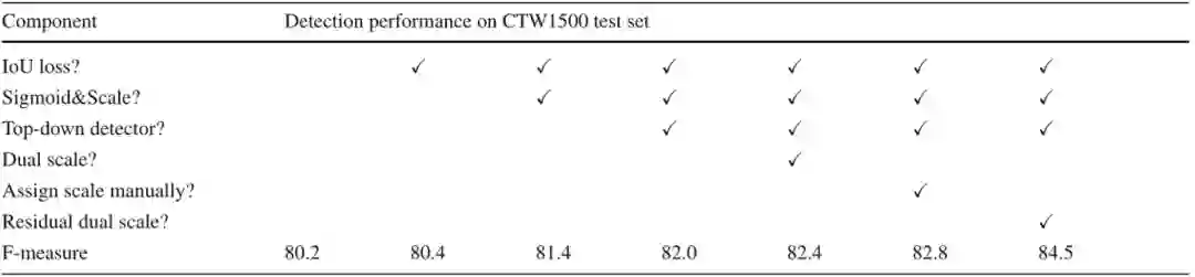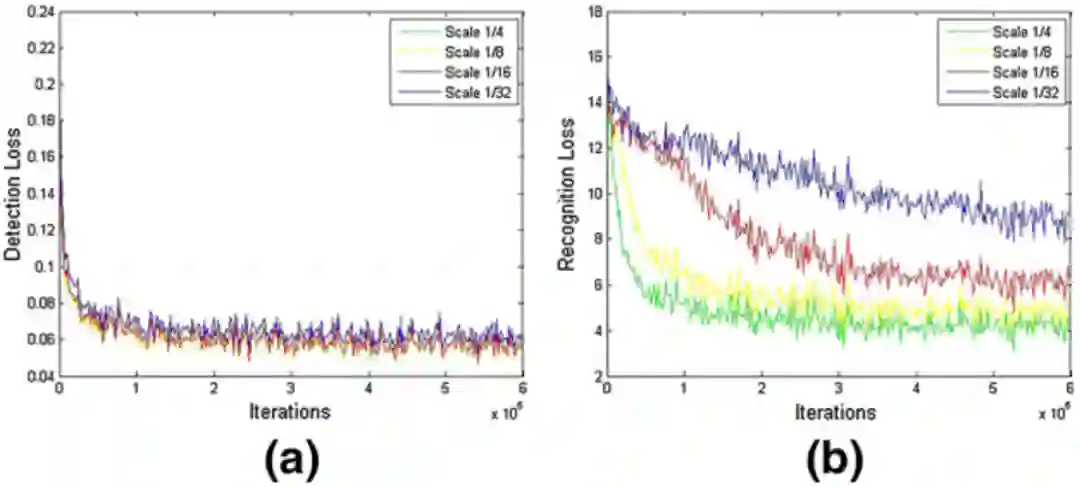 为了验证融合自底向上和自顶向下的优势,还有残差双尺度机制的有效性,本文做了一些消融实验如Table 6所示。结果表明,本文所提出的自顶向下检测器和自底向上检测器可以很好的相互促进,联合训练两种检测器使得该方法不受感受野的限制,同时避免了粘连问题。本文也验证了所提出的残差双尺度机制优于并行的双尺度机制,也优于人工设定的尺度分配机制,证明了双尺度机制的优越性。同时,为了验证尺度大小对检测和识别的影响,本文评估了该方法的一个变种,包含了1/4到1/32的四个尺度,检测和识别的损失函数曲线如Fig 6所示。可以看出每个尺度检测损失差别不大,但是识别任务的损失差距很大。同时,本文还衡量了不同尺度的识别器的行正确率,1/4和1/8尺度的行正确率差别小于2%,但是1/4和1/32的行正确率差距大于25%。这证明了文本识别任务需要更高分辨率的特征,因此本文仅仅采用双尺度端到端识别。