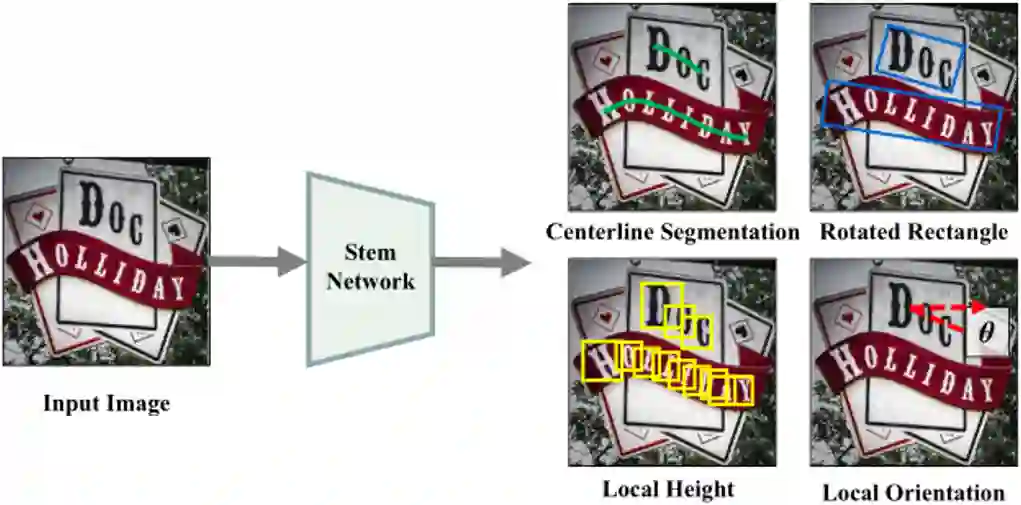 关于任意形状文本检测器,本文采用预测文本行局部几何特征的方式。并增加了自顶向下的检测器来解决相邻文本行的粘连问题。检测器的输出如Fig.4所示。检测器主要包含三个任务:第一个任务是中心线分割任务,这个任务可以被看作像素级别的分类任务。第二个任务是自底向上的检测任务,这个任务的目的是描述文本行的局部几何特征,包含局部高度和局部角度。最后一个任务是自顶向下的检测任务,这个任务用旋转矩形的形式来表示文本行感兴趣区域,被检测到的文本感兴趣区域将在推理阶段带来更好的分词效果。