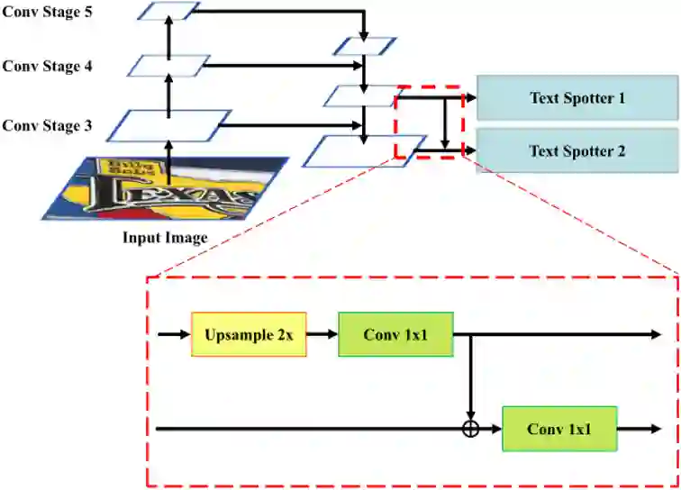 关于残差双尺度端到端识别机制,本文采用双尺度端到端识别器来处理场景文本中的尺度变化问题。其中第一个尺度的端到端识别器目的是最大化识别性能,之后第二个识别器能够更专注解决第一个识别器无法处理的文本行。所提出的残差双尺度结构如Fig.3所示,对于第一个尺度的端到端识别器,输入的视觉特征是由Conv Stage 4到Stage 5融合得到的。第二个尺度的端到端识别器的输入特征是从Conv Stage 3到Conv Stage 5融合得到的。由于识别器需要更细粒度的特征,因此两个识别器的输入特征都上采样到原图的1/4大小。和之前的方法不同,本文使两个识别器不再独立工作,而是第二个识别器是基于第一个识别器的残差。