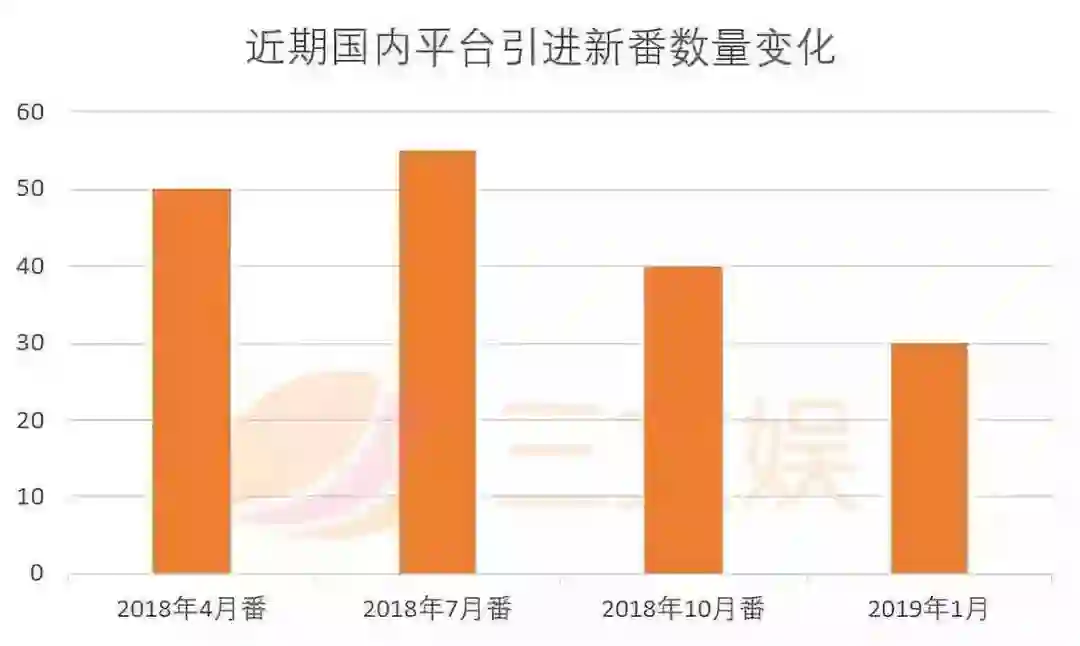 三文娱统计数据显示,从2018年4月至2019年第一季度,中国采购的番剧数量越来越少。2018年7月和10月上市的新番中,爱奇艺、腾讯、优酷的采购量均在10部以下,其中优酷连续两个季度仅有1部番剧独播,基本上淡出了新番版权的竞争,而腾讯视频在此前一年上线了38部国创动漫,远远超过了日漫的数量。