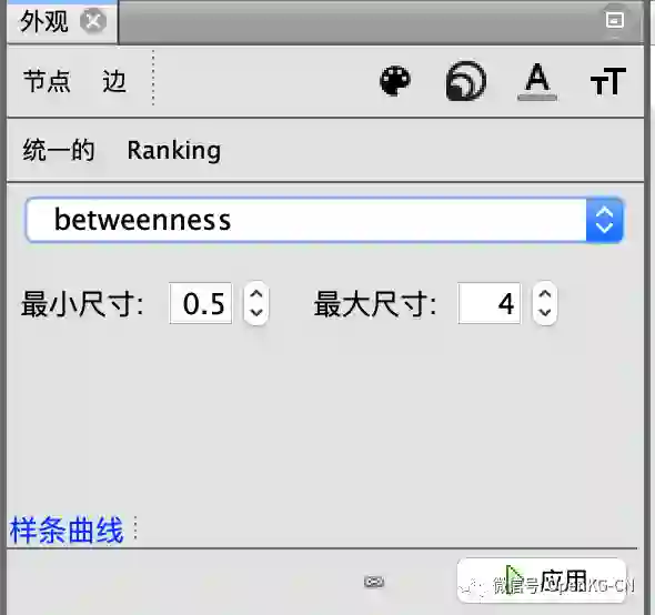 在外观-节点-大小-Ranking 中选择 betweenness(这里的 betweenness 就是我们刚才为每个点添加的 betweenness 属性)