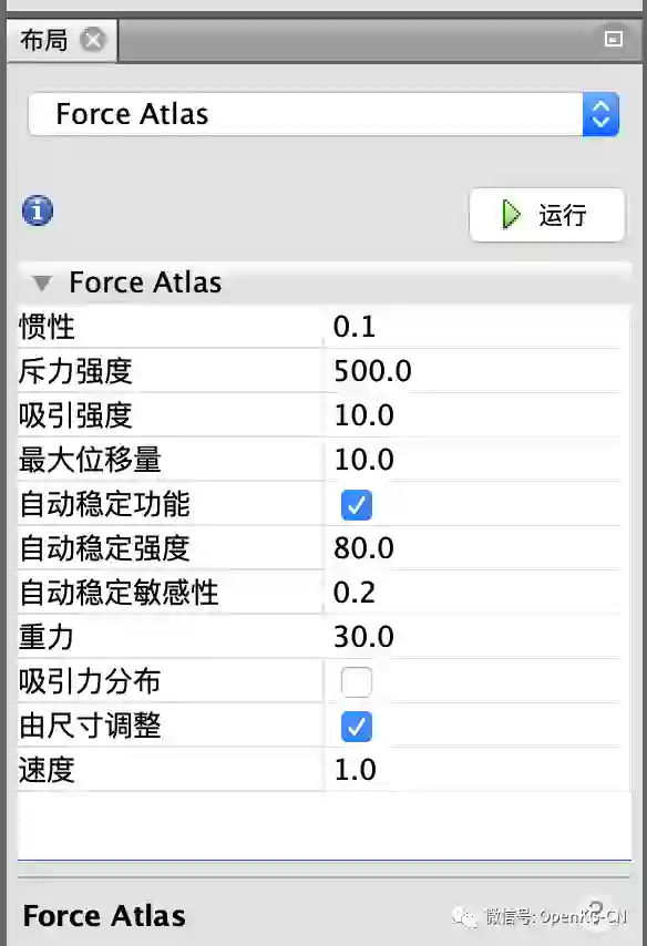 Force Atlas 为力引导布局,力引导布局方法能够产生相当优美的网络布局,并充分展现网络的整体结构及其自同构特征。力引导布局即模仿物理世界的引力和斥力,自动布局直到力平衡。