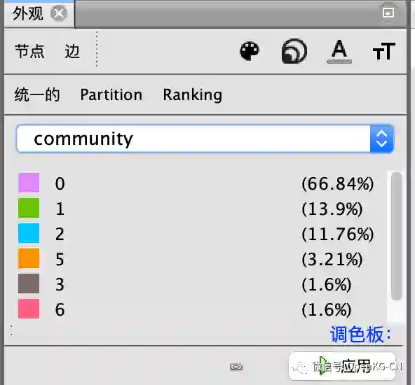 在外观-节点-颜色-Partition 中选择 community(这里的 community 就是我们刚才为每个点添加的社区编号属性)