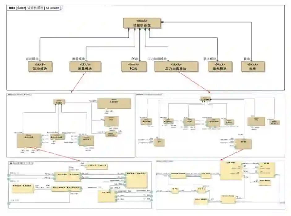 以 FBS扩展模型为指导,基于 SysML建模语言针对微动摩擦磨损试验机进行设计,构建以下模型:组织架构、需求(利益相关者需求、试验机系统需求)、试验机功能结构、系统结构、试验机接口定义以及行为模型,而后采用 SysGraph Modeler工具进行建模实践,以下以模型组织架构图和系统结构图为示例说明如何采用 SysGraph Modeler开展基于模型的复杂机电系统的设计。