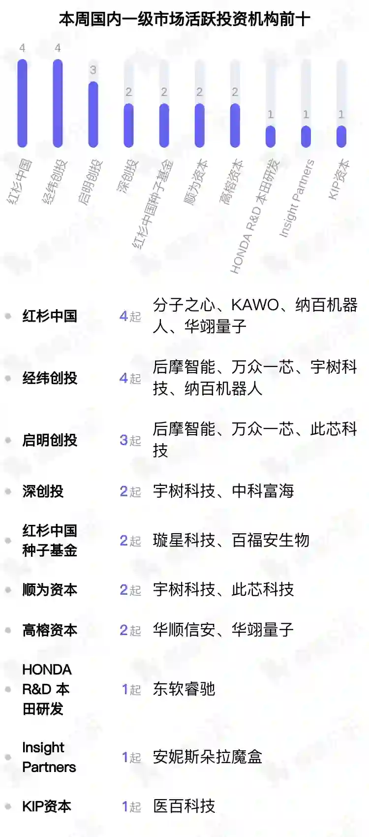 从参与投资的项目数来看,其中红杉中国投资4起,经纬创投投资4起,启明创投投资3起。