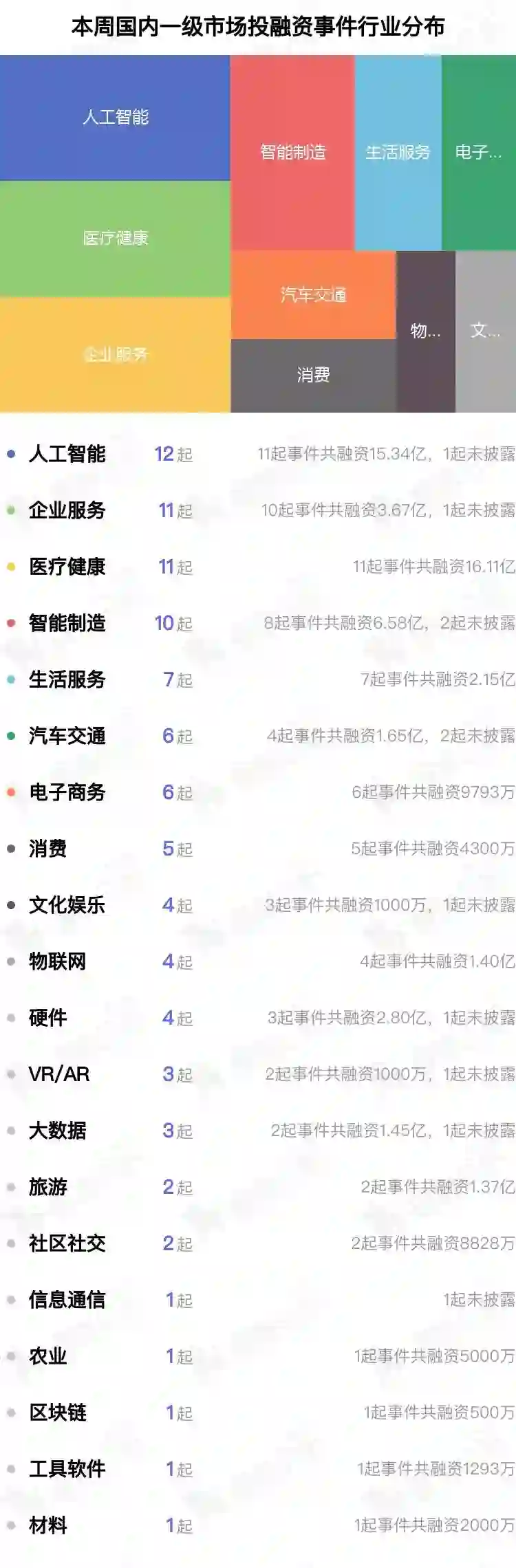 从融资案例数量来看,本周人工智能、企业服务、医疗健康领域融资最活跃,分别为12起、11起、11起。
