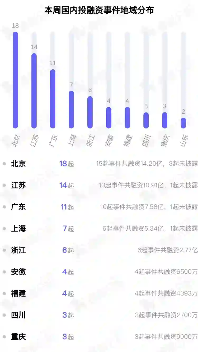 从机构投资活跃度来看,红杉中国、经纬创投、启明创投在本周创投市场中较为活跃。