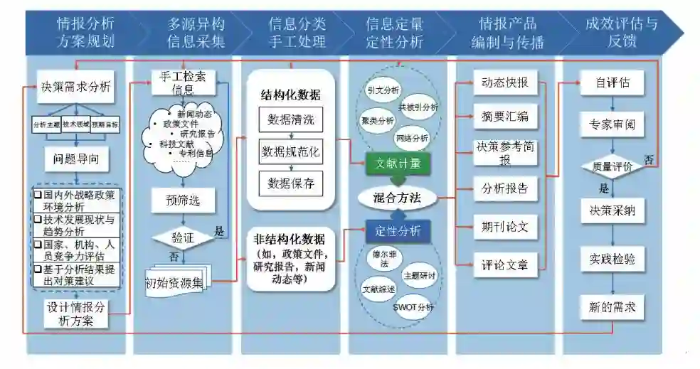 传统的科技情报研究框架包括6个连贯且迭代的阶段:情报分析方案规划、多源异构信息采集、信息分类手工处理、信息定量定性分析、情报产品编制与传播,以及支撑决策的成效评估与反馈。每个阶段的任务主要由科技情报研究人员人工实施,最大的问题是每个阶段需要耗费大量的时间和人力工作,特别是在信息检索采集、信息集成和信息分析阶段。从而导致科技情报研究的效率和时效性受到较大的负面影响。