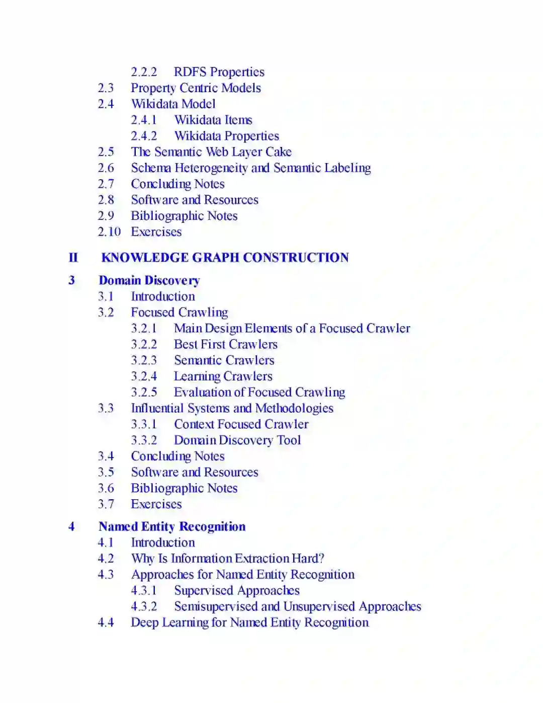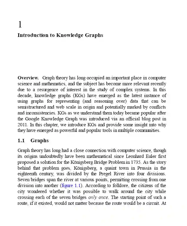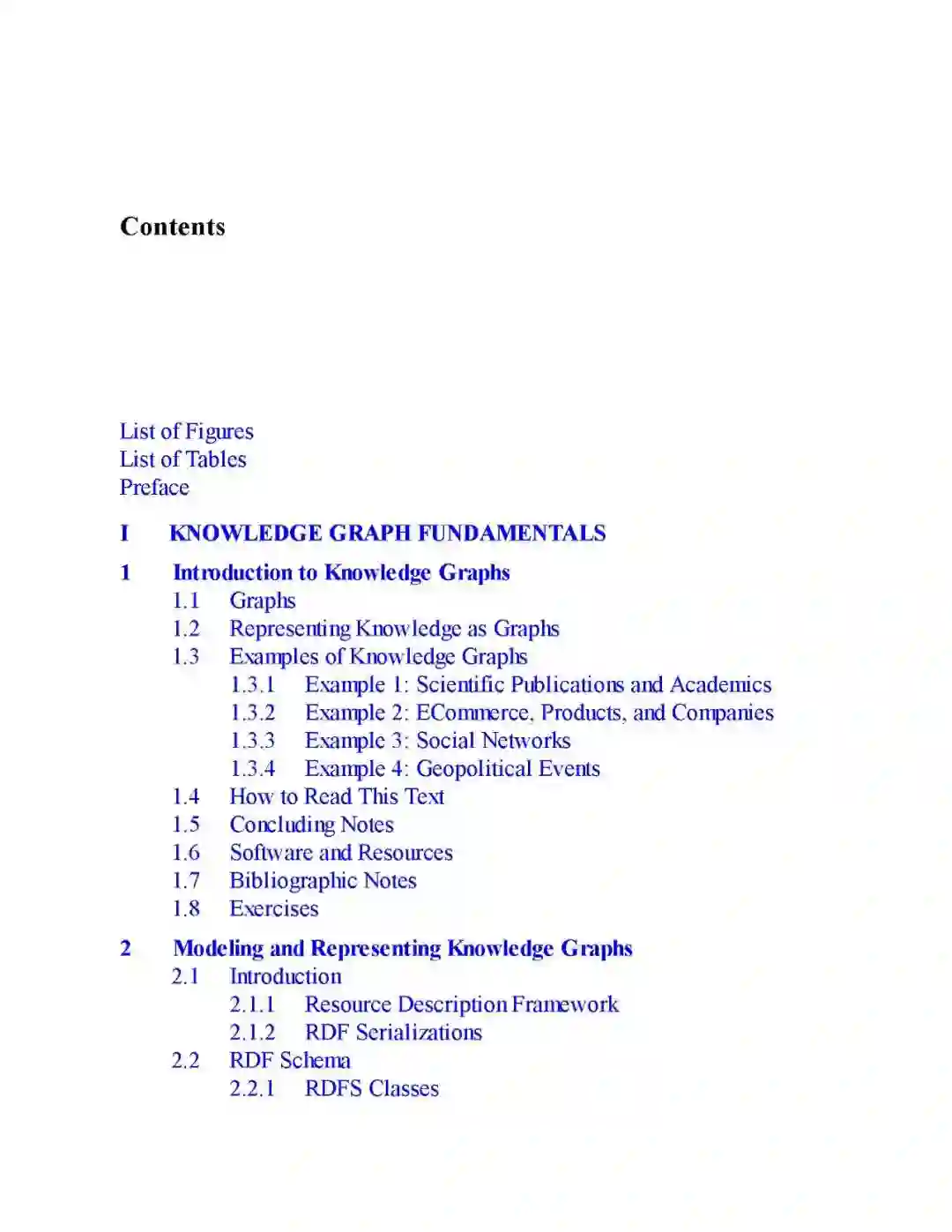 在介绍了介绍性和背景材料之后,本文涵盖了构建知识图谱、向知识图谱添加新知识(或在知识图中精炼旧知识)以及访问(或查询)知识图谱的技术。最后,书中描述了特定的知识图谱生态系统,与每个生态系统对应的几个现实世界的应用和案例研究。每一章结尾都有软件和资源部分,以及建议阅读的参考书目。章末练习共130个,代表了不同的抽象层次。