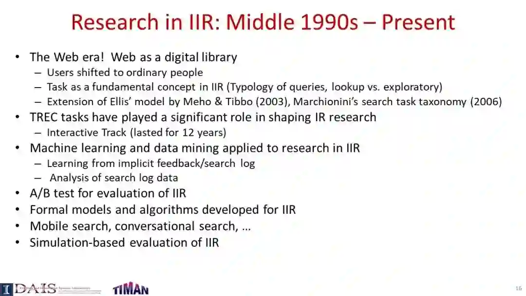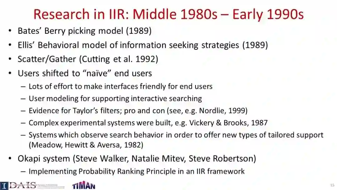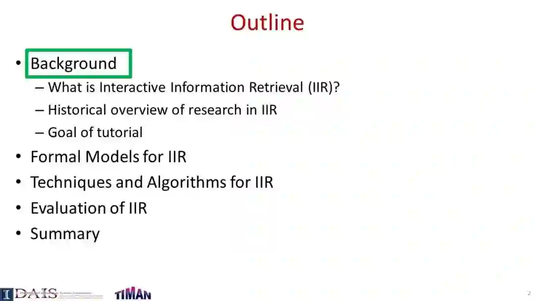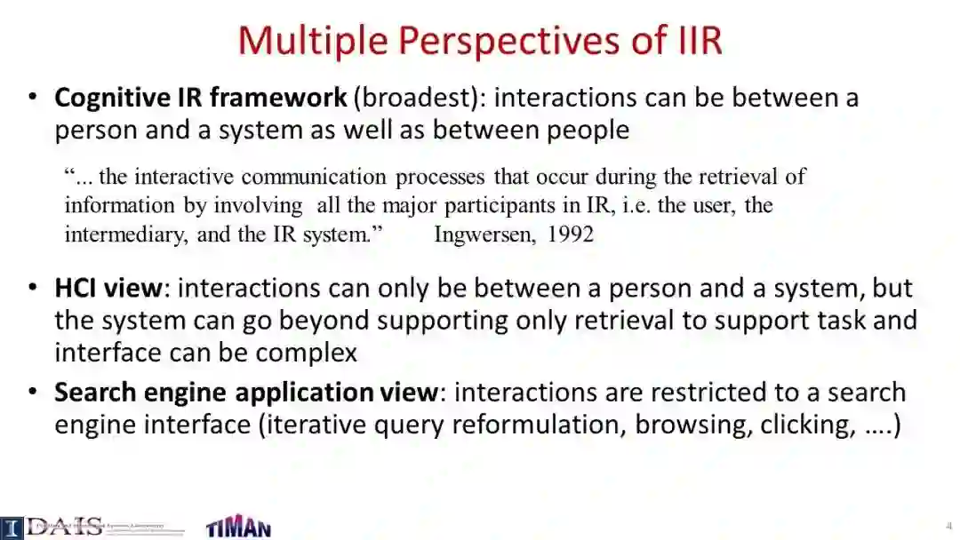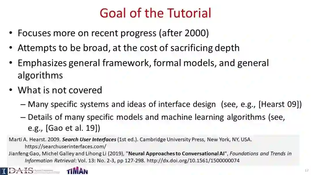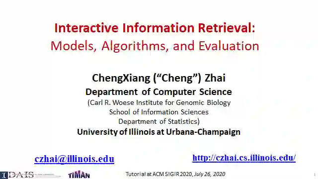由于信息检索(IR)通常是一个交互过程,因此研究交互式信息检索(IIR)是很重要的,在IIR中,我们将尝试建模和优化整个交互式检索过程(而不是单个查询),同时考虑用户可能与搜索引擎交互的许多不同方式。本教程系统地回顾了IIR的研究进展,重点介绍了IIR的模型、算法和评估策略的最新进展。首先对IIR的研究进行了广泛的概述,然后介绍了使用合作博弈框架进行IIR的形式化模型,并涵盖了决策理论模型,如接口卡模型和IIR的概率排序原理。接下来,它提供了一个审查一些代表特定的信息检索的技术和算法,如各种形式的反馈技术和多样化的搜索结果,然后讨论了应该如何评价一个信息检索系统和多种策略提出最近使用模拟的用户评价信息检索。本教程最后简要讨论了IIR中的主要开放挑战和一些最有前途的未来研究方向。