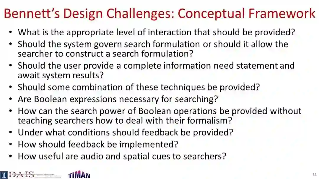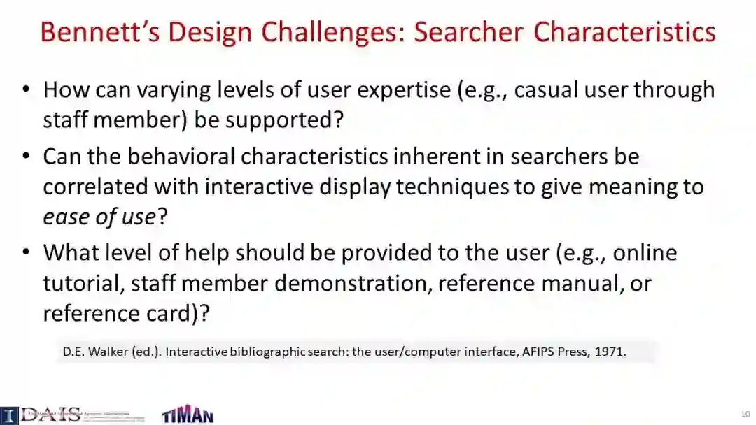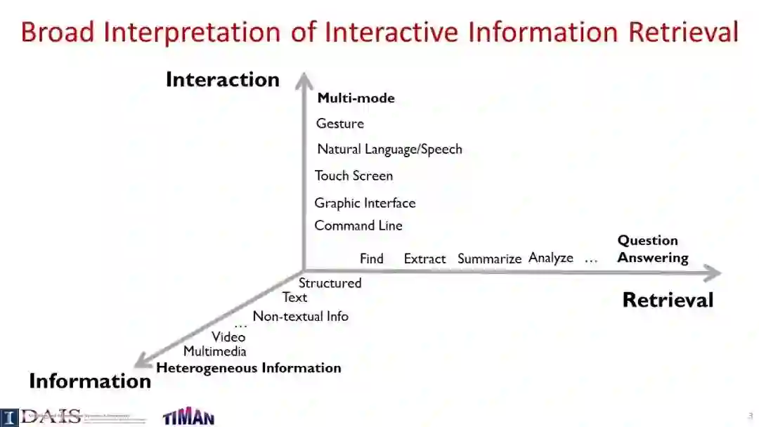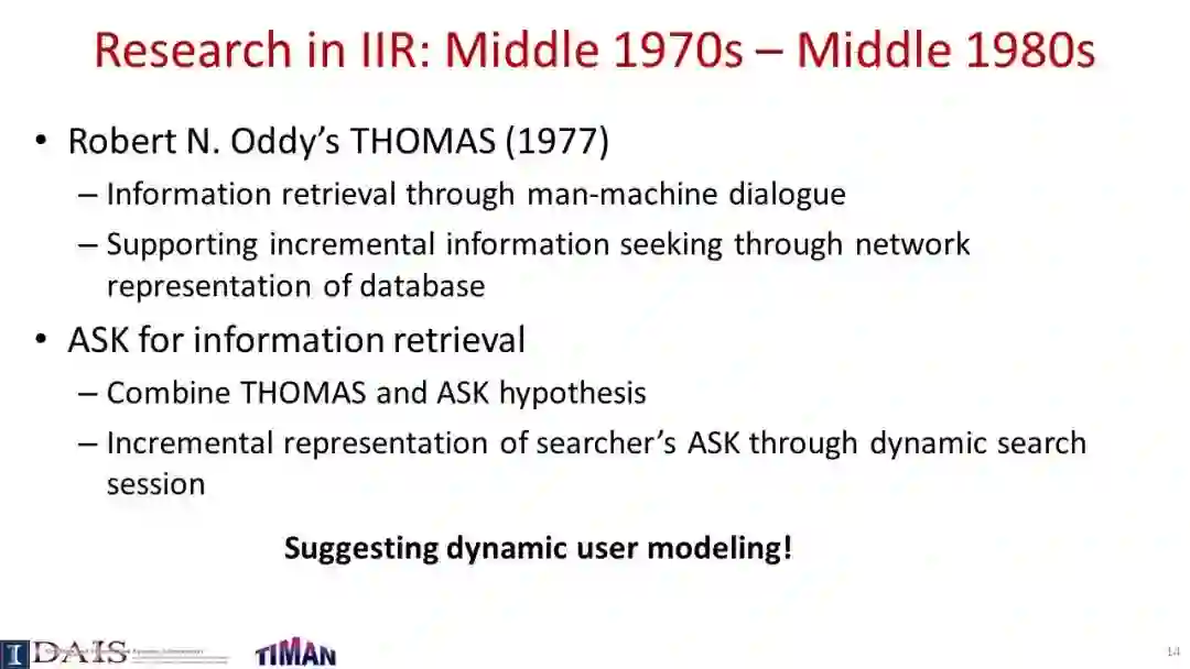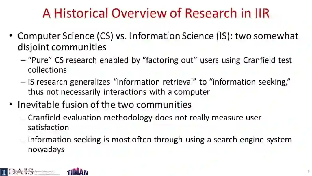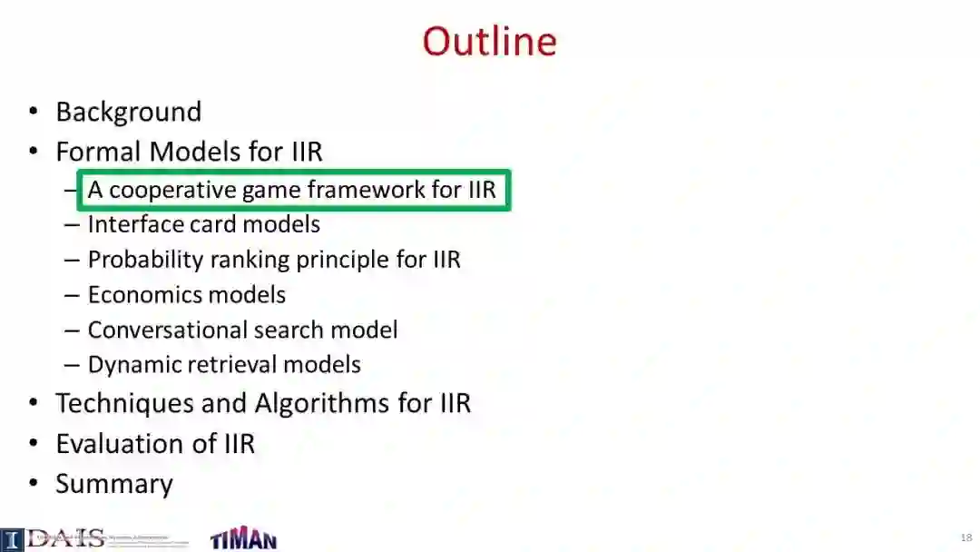 由于信息检索(IR)通常是一个交互过程,因此研究交互式信息检索(IIR)是很重要的,在IIR中,我们将尝试建模和优化整个交互式检索过程(而不是单个查询),同时考虑用户可能与搜索引擎交互的许多不同方式。本教程系统地回顾了IIR的研究进展,重点介绍了IIR的模型、算法和评估策略的最新进展。首先对IIR的研究进行了广泛的概述,然后介绍了使用合作博弈框架进行IIR的形式化模型,并涵盖了决策理论模型,如接口卡模型和IIR的概率排序原理。接下来,它提供了一个审查一些代表特定的信息检索的技术和算法,如各种形式的反馈技术和多样化的搜索结果,然后讨论了应该如何评价一个信息检索系统和多种策略提出最近使用模拟的用户评价信息检索。本教程最后简要讨论了IIR中的主要开放挑战和一些最有前途的未来研究方向。