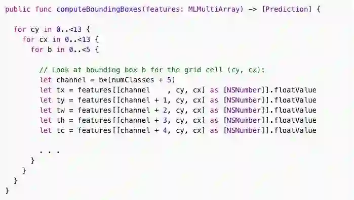 要获得一个边界框坐标tx,ty,tw,th和置信度得分tc,可以用下标索引遍历MLMultiArray。不幸的是,我们不能简单地写: