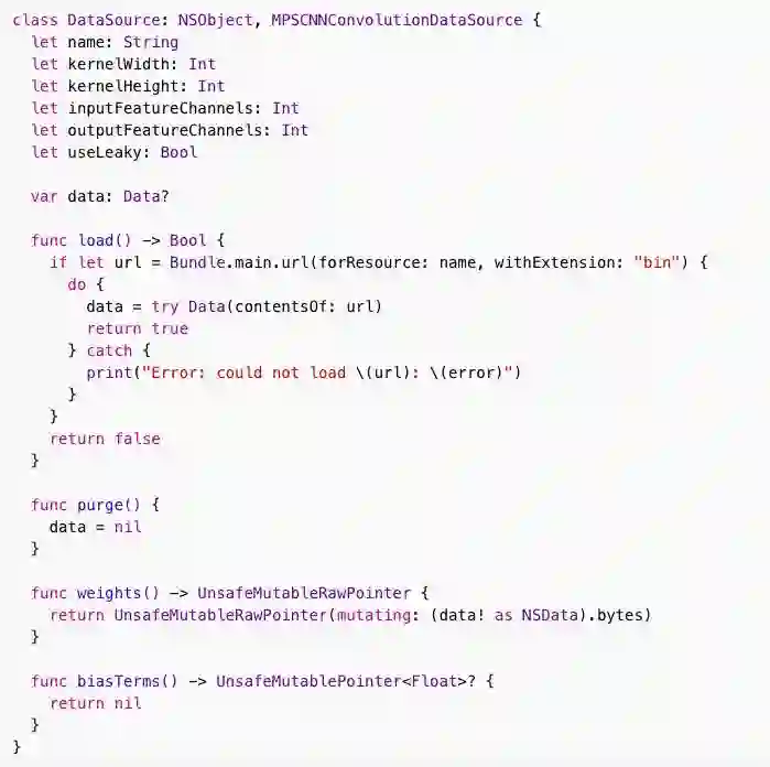 该MPSCNNConvolutionDataSource需要具有load()和purge()函数。在这里,我们只需将上一步导出的二进制文件(例如,conv1.bin)加载到Data对象中即可。