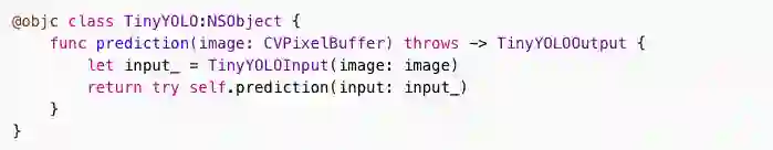 这个类还有很多代码,我可以暂不关心。我们关心的是prediction(image)方法。此方法输入CVPixelBuffer(一个包含图像的对象)并返回一个TinyYOLOOutput对象。