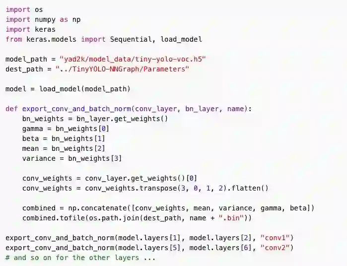 然后,它遍历所有卷积层,并将权重与批次正则化参数一起放入单个文件中,每个层一个文件。这样做不是必须的,而且还会有大量的小文件。但这使得在应用程序中更容易加载这些数据。
