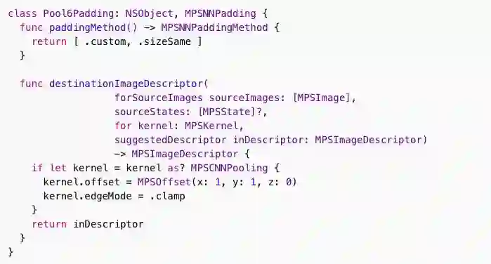 使用graph API,无法让max-pooling层使用“clamp"填充。为此,必须编写自己的MPSNNPadding类。