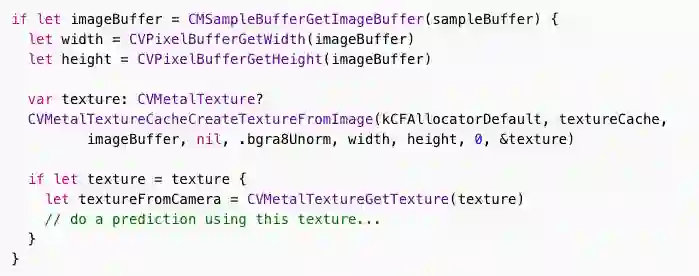 使用Core ML,输入图像必须是一个CVPixelBuffer,但Metal需要MTLTexture。在下面代码中,我们可以轻松地将相机中的像素转换为texture: