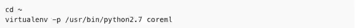 该-p标志告诉virtualenv使用系统版本的Python 2.7。正如我在上面指出的,这是至关重要的。如果您使用另一个Python版本(即使是2.7,必须是系统自带的版本),则coremltools包将给出错误。