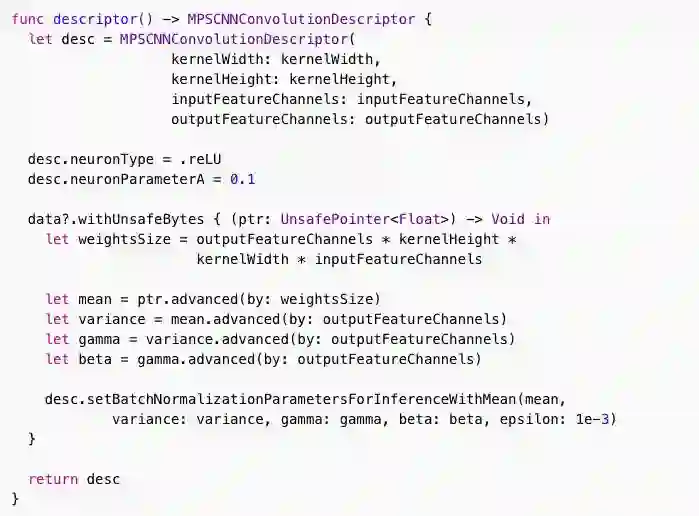 setBatchNormalizationParametersForInferenceWithMean()函数也是新的。这使得处理批量正则比以前容易得多。我们还在Data对象中存储mean,variance,gamma和β,通过设置正确的UnsafePointer,然后调用该方法。