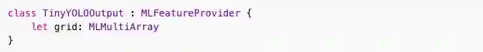 这个类的相关部分是MLMultiArray对象。它包含13×13网格的边框预测。(该属性被称作grid,是因为我们在转换脚本中,使用output_names='grid'这个参数指定了该属性。)