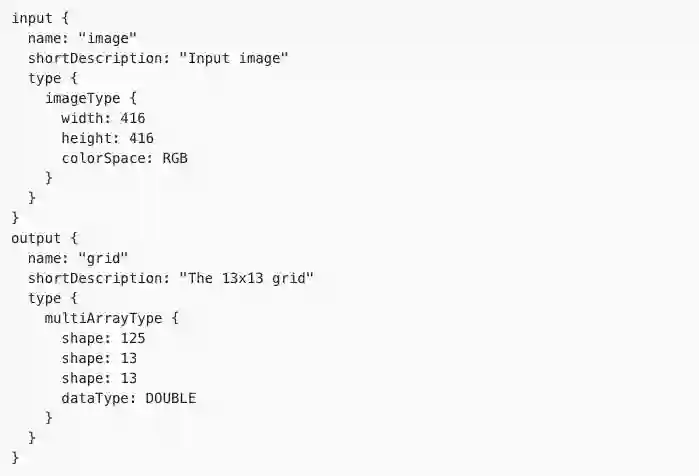 注意:转换脚本调用coremltools.converters.keras.convert()时不指定class_labels参数。当您指定class_labels时,转换器创建一个模型,输出一个字典(String, Double)与模型训练的类的概率。但是YOLO不是分类器。通过省略class_labels参数,转换工具不会以任何方式去计算最后一层的概率分布,我们直接访问最后一层的输出(feature map)。