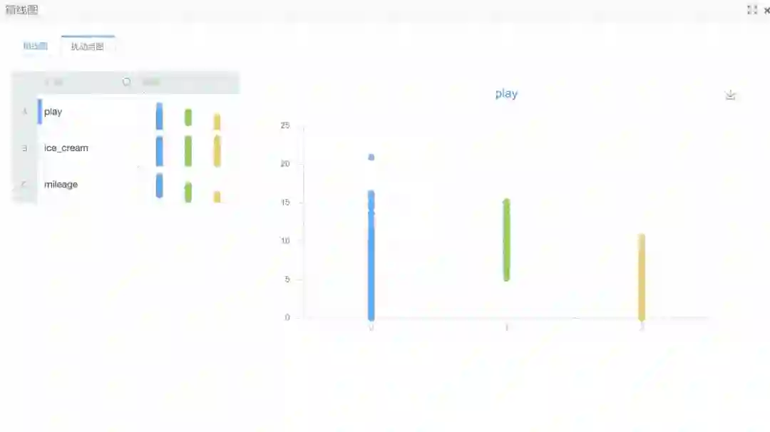 1,箱线图组件分两个tab分别显示箱线图和扰动点图,在左上角都可以选择观测不同的特征。右侧显示该特征下,每个类别的分布情况。