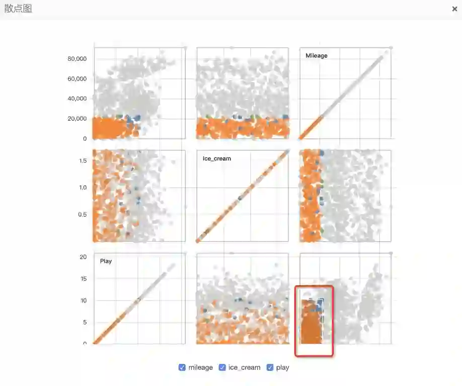 2,除了反对角线上的三个方形,其他方形则是反映了两两特征之间的分布情况。比如第一排第一列(1,1),横坐标为play,纵坐标为mileage。从这个方形上可以直观观测出不同颜色的散点集中分布在不同区域。
