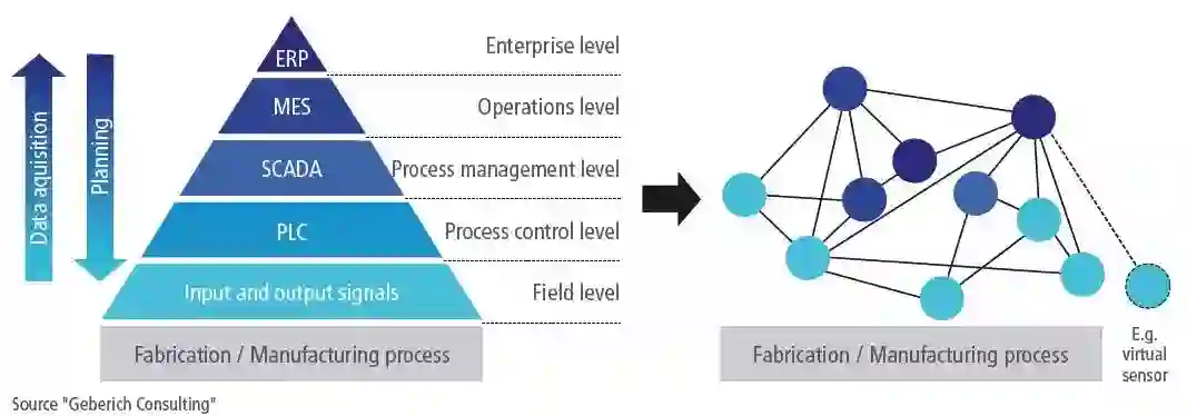 目前的绝大多数系统遵循ISA 95企业参考架构规范(www.isa95.org)进行设计,而在不远的将来,传统的金字塔架构将成为历史。更高的连接性和更强的灵活性需求,正在触发金字塔架构向平展化的趋势演进。
