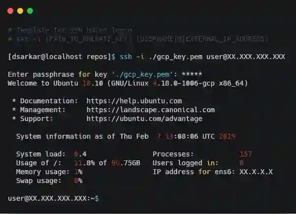 记住要妥善保存自己的 SSH 密钥,然后你就可以使用如下命令从终端登录到服务器了。