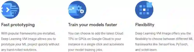 谷歌云深度学习虚拟机镜像允许开发人员在谷歌计算引擎 (Google Compute Engine) 实例上实例化一个虚拟机镜像,该镜像预装了流行的深度学习和机器学习框架。我们可以在计算引擎实例中启动一个预装的 ML 流行框架 (如 TensorFlow、PyTorch 或 Scikit-Learn)。最棒的是,我们也可以通过一键点击来添加对 TPU 和 GPU 的支持。它的价格也非常具有竞争力,比 AWS 要便宜得多。对于 GCP 虚拟机,我们可以用每小时 0.45 美元的价格使用 12GB 的 Tesla K80GPU!