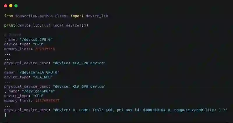通过上图可知,我们免费获得了一个具有 12GB 显存的 Tesla K80 GPU,这相当于 AWS 中价值 0.9 美元 / 小时的 p2.xlarge 实例。最后,可以使用下面的代码来确认正在使用 GPU 的深度学习类库。
