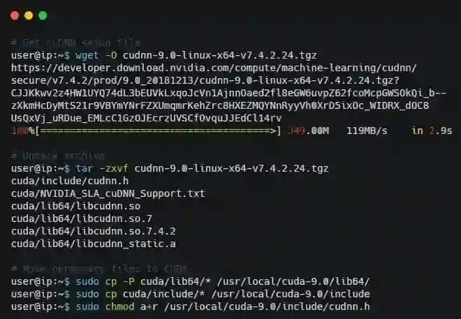 cuDNN 是一个针对深度神经网络的 GPU 加速类库。cuDNN 库为神经网络中的标准例程提供了一个高度调优的实现,包括前向和后向卷积、池化层、归一化和激活函数层。深度学习从业者可以完全依靠 cuDNN,它极大地加速了使用 GPU 的深度学习框架。你可以从 官方页面 下载,但首先要注册一个 NVIDIA 帐户。你可以得到一个 cuDNN 的下载链接,然后就可以在远程服务器终端上直接下载。