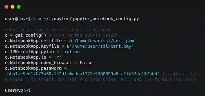 下一步我们为 Jupyter Notebook 服务器生成了一个配置文件。通常该文件位于~/.jupyter/jupyter_notebook_config.py。如果不存在,可以使用以下命令创建。