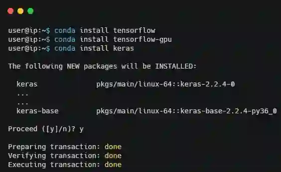现在,我们需要安装和设置基于 Python 的深度学习框架。我们通常使用 Keras 或 Tensorflow 框架,下面的命令可以帮助我们在环境中安装这些框架。
