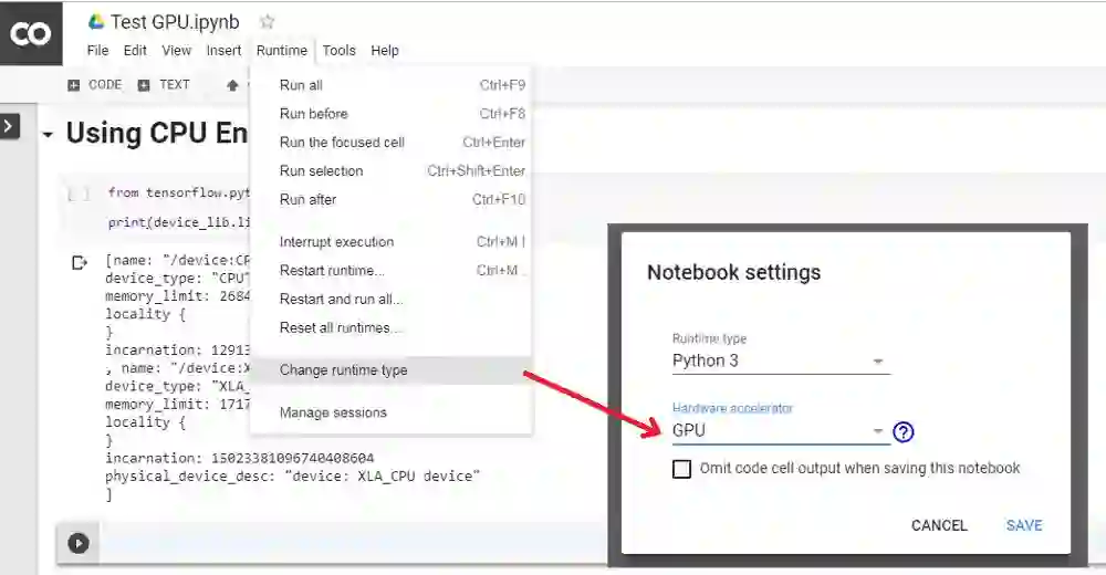 现如今,这种开发环境只能处理那些计算任务和数据量较少的相对简单的模型,更多时候我们需要利用 GPU 来解决更复杂的问题。Google Colab 只需要数秒就可以将运行时从 CPU 更改为 GPU,操作如下所示: