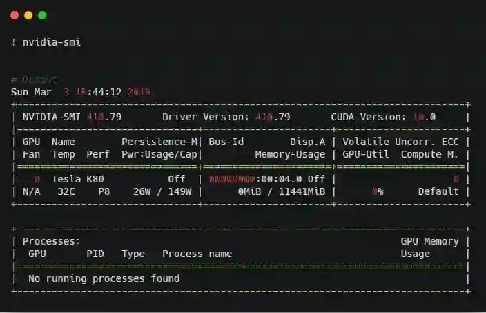 完成上述操作后,Google Colab 将申请一个新的基于 GPU 的深度学习环境,我们可以使用如下指令查看 GPU 类型: