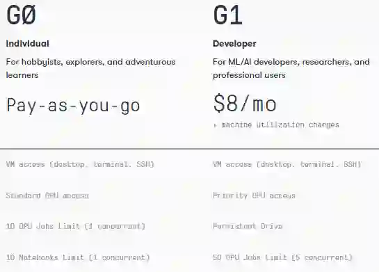 以下是他们的一些基本用户方案 (更多方案信息参阅 https://www.paperspace.com/pricing)。