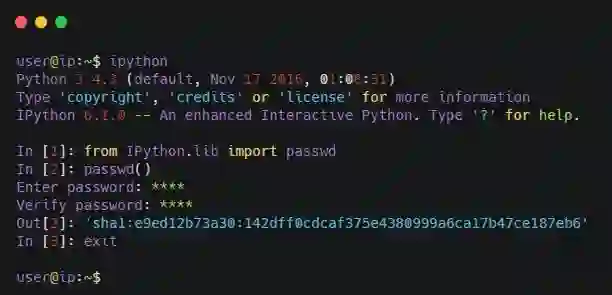 为启用 Notebook 的密码保护,我们需要首先生成一个密码及其散列。具体可以使用 Ipython.lib 中的 passwd() 函数实现,过程如下所示: