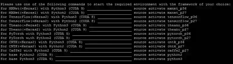 你可以使用一个 Conda AMI,它为每个深度学习框架提都提供了单独的虚拟环境;你也可以使用一个 Base AMI,用于自定义配置和构建。