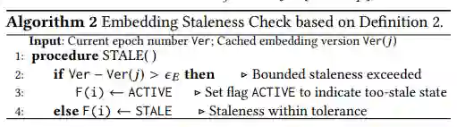 陈旧性最基本的定义是:让和 e 分别表示陈旧嵌入的 epoch 数和当前 epoch 数,可容忍的陈旧 epochs 的最大值为