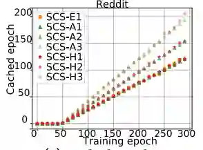 如图绘制了在 SANCUS 训练中实际执行广播的相应 epoch。图中 SCS-E1 每 2 个 epoch 就会广播最新结果。因此,橙色点表示的缓存 epoch 有规律地增加。对于自适应方案 SCS-A 和 SCS-H,通过观察点间间距的变化发现广播呈不规则模式,尤其是基于变化量的 SCS-H。
