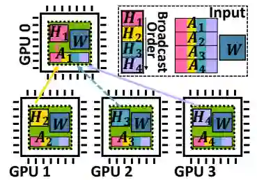 (3)否则,如果特征的陈旧性超过边界,则将最新嵌入一对多并行广播到所有 GPU,在缓存中更新。在 GPU 轮询一轮之后,就可以为一层更新整个嵌入矩阵 H;